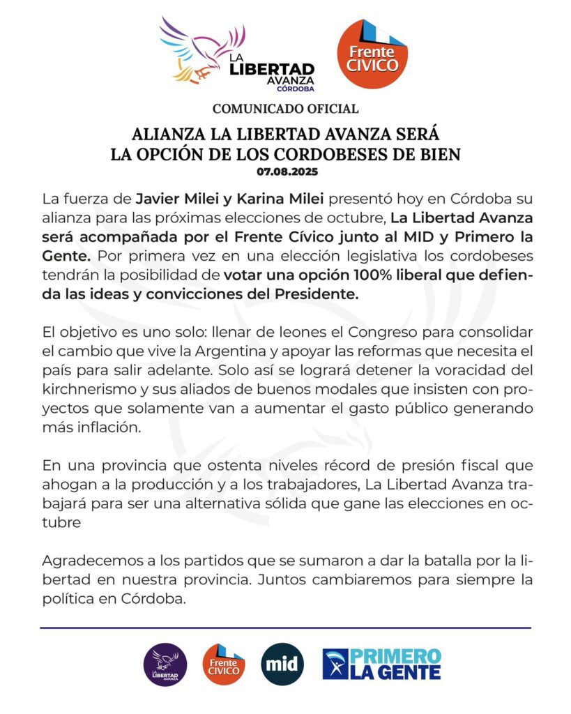 Este 7 de agosto, La Libertad Avanza oficializó en Córdoba su nuevo frente electoral de cara a las elecciones legislativas de octubre. La fuerza que lidera Javier Milei contará con el acompañamiento del Frente Cívico, el MID y Primero la Gente, configurando por primera vez una opción legislativa 100% liberal en la provincia.